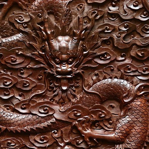 此寶座選用珍貴的大紅酸枝作為原材料,搭腦呈平頭狀,靠背中間高,向兩邊扶手遞減呈梯形。結(jié)構(gòu)設(shè)計(jì)巧妙,對(duì)稱布局,每個(gè)面板皆雕著一條騰飛的金龍,刀法精密,圓潤(rùn)渾厚;龍紋栩栩如生,云紋舒卷生動(dòng),龍的姿態(tài)各異,有的昂首前瞻,有的回首瞭望,動(dòng)感十足。座面嵌裝硬板,束腰內(nèi)收,雕有纏連枝紋,四條三彎腿做同樣的獸首,足下踩有豐碩的地平,端莊穩(wěn)重。